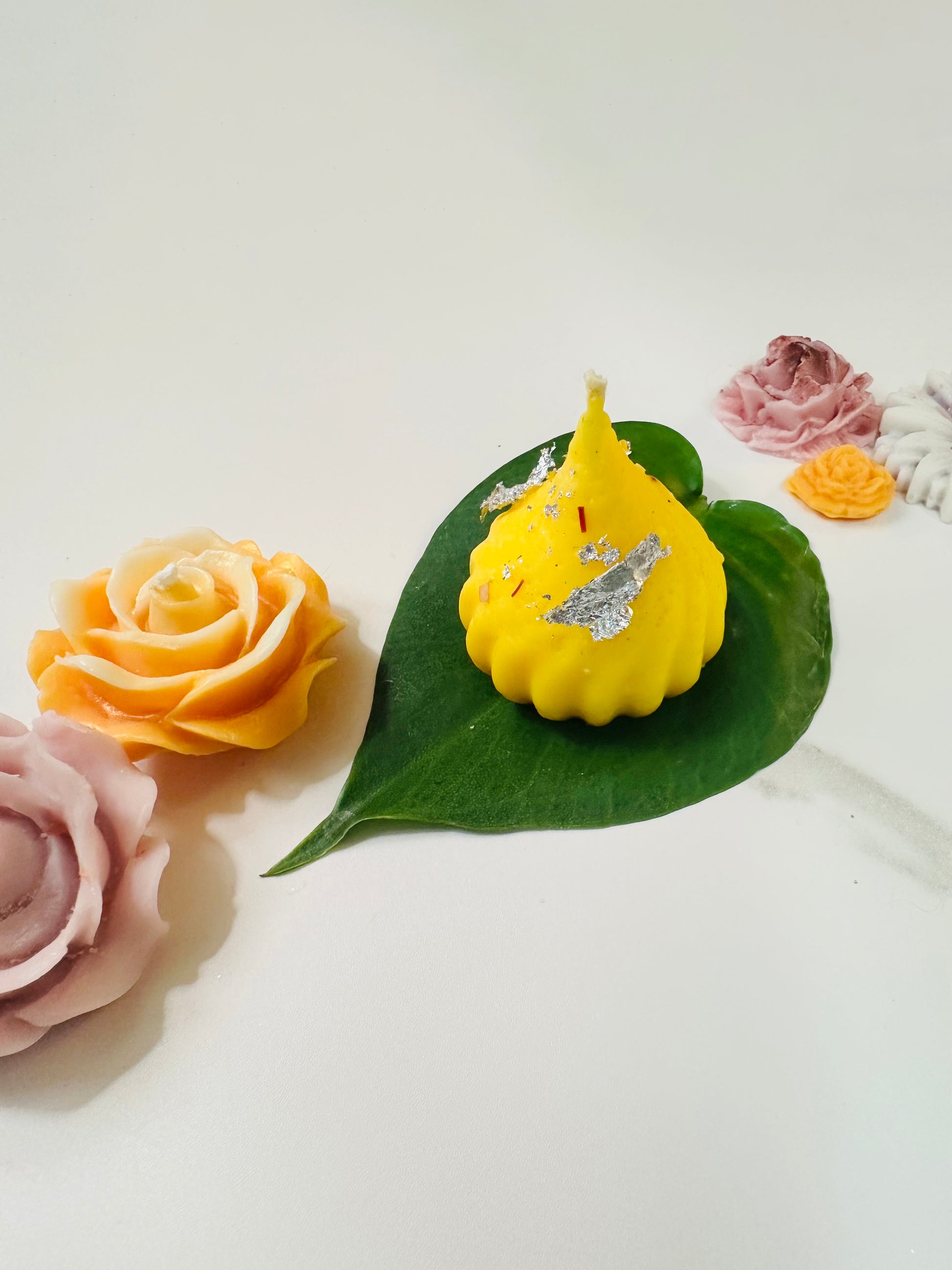 Celebrate tradition with a modern twist using our handcrafted Modak Candle, inspired by the traditional Indian sweet offered during festivals, especially Ganesh Chaturthi. With its intricate, pleated design, this candle brings cultural heritage and warmth into any space. Hand-poured using 100% natural soy wax, it burns cleanly and can be customized with your choice of fragrance and color. The perfect addition to your festive decor or as a thoughtful gift for loved ones.